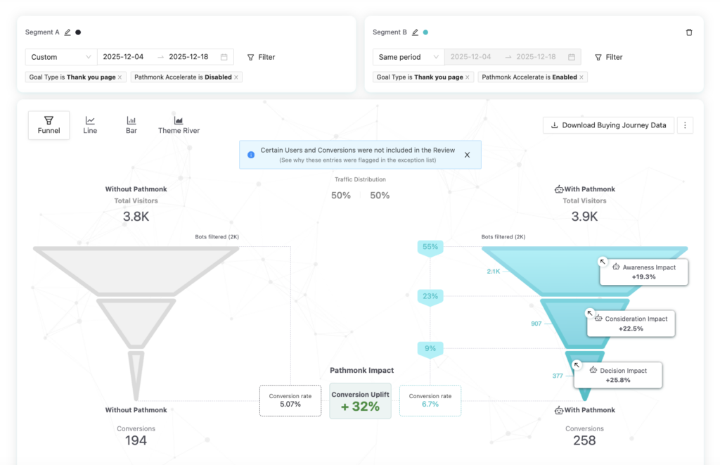 Across the 14-day evaluation period, Pathmonk consistently outperformed the control group at every stage of the funnel—awareness, consideration, and decision—making the uplift fully attributable to the AI-powered experiences rather than changes in traffic, seasonality, or website updates.