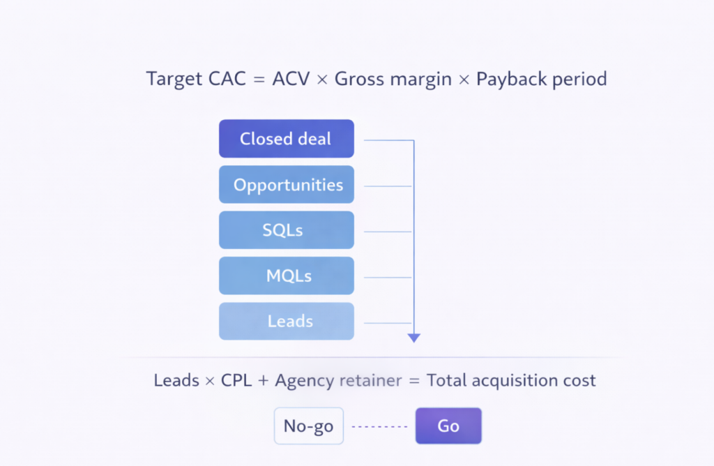 Target CAC = acceptable payback period × monthly gross margin × ACV structure.